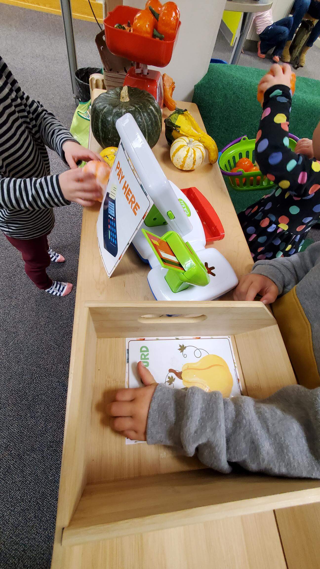- Our market stall transformed into a pumpkin patch this fall, encouraging kids to pretend play as they bought, sold, and organized pumpkins!