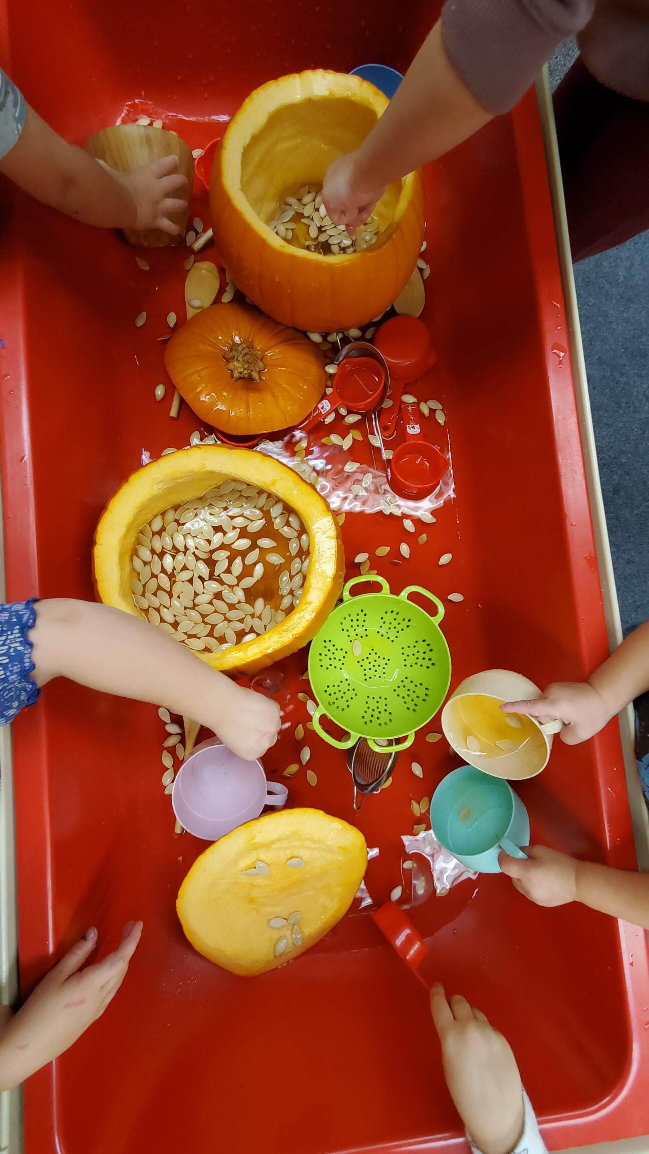 - This week we read the book Pumpkin Soup by Helen Cooper, and it only made sense that we try to make our own pumpkin soup just like Cat, Squirrel, and Duck in the story. With a couple of pumpkins, water, and tools to scoop and pour, our sensory tub this week served up the perfect bowl of fun!