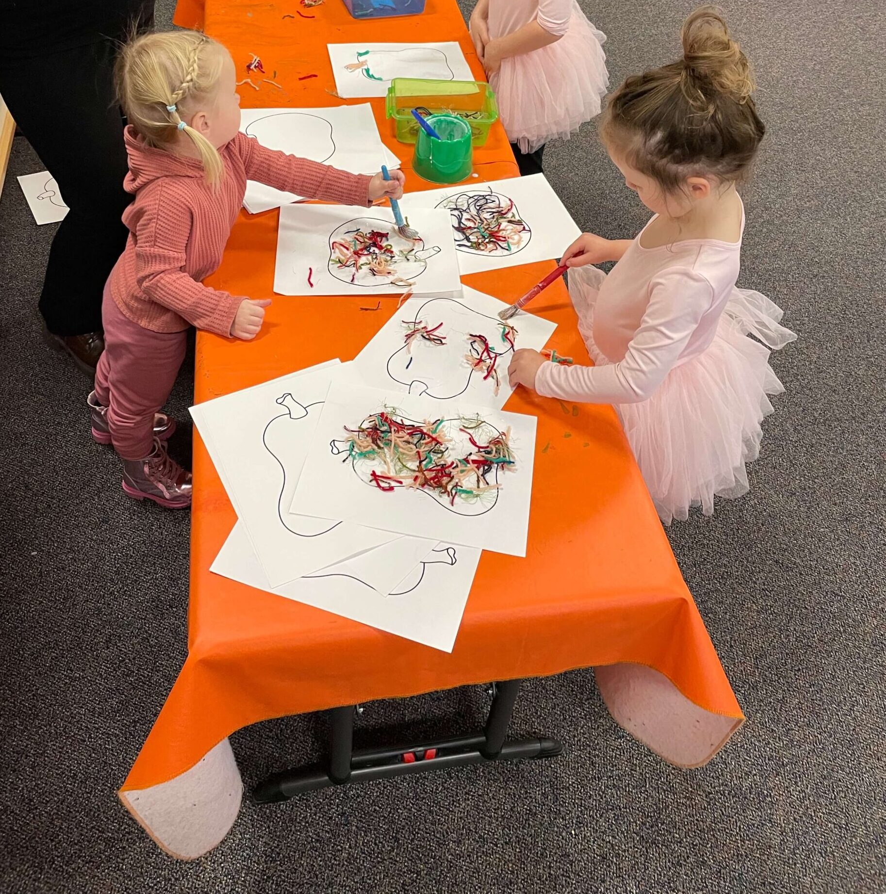 - This simple process art activity provides plenty of opportunities to practice fine motor skills! First, kids used jumbo paintbrushes to spread glue over a pumpkin picture. Then they used their fingers or a pair of tongs to place strips of yarn over the glue in order to fill in their pumpkin.