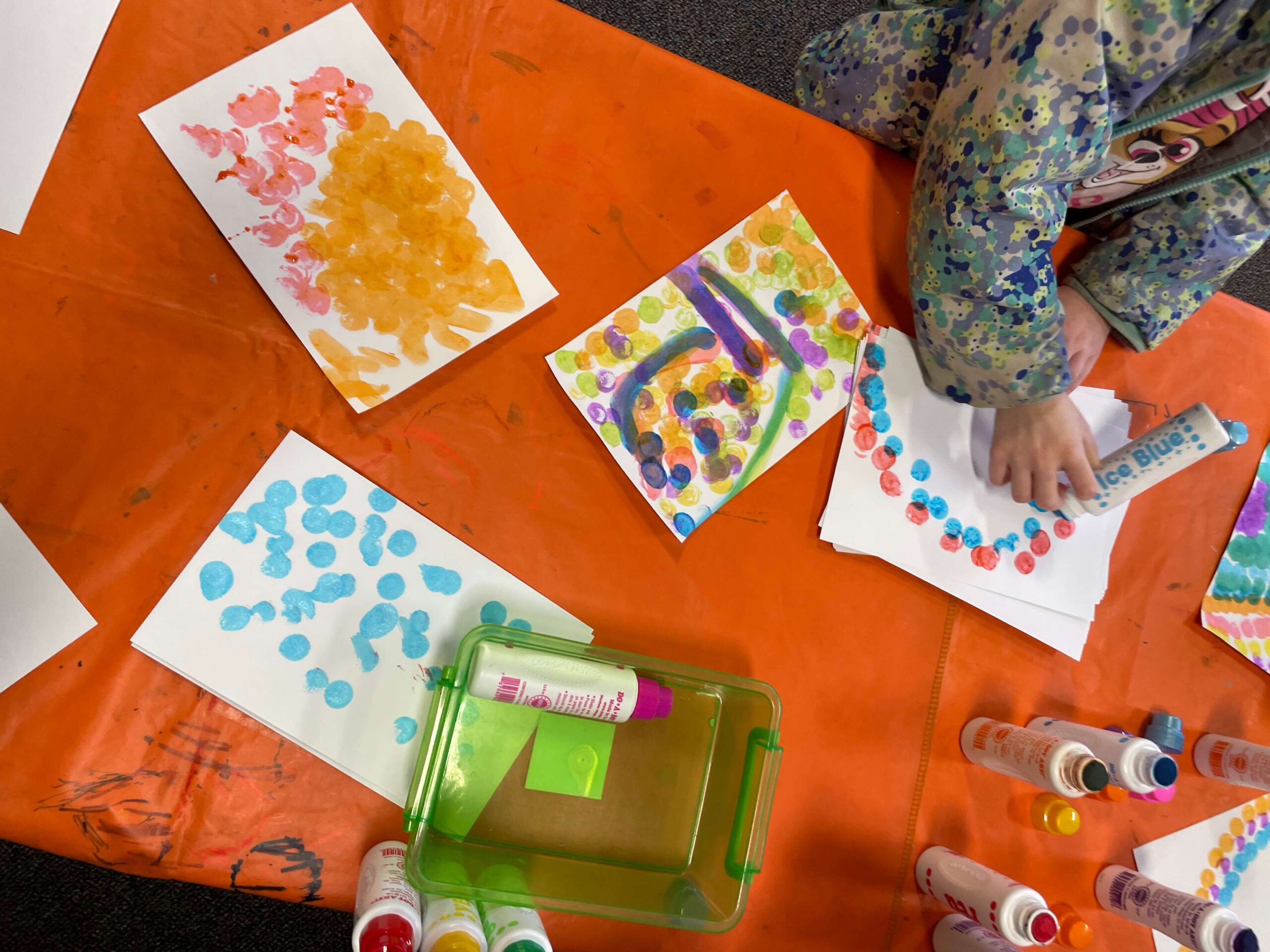 - Dot markers are a familiar favorite in our collection of art supplies! This week kids created designs on half sheets of paper. They made rainbows, ocean scenes, and more!