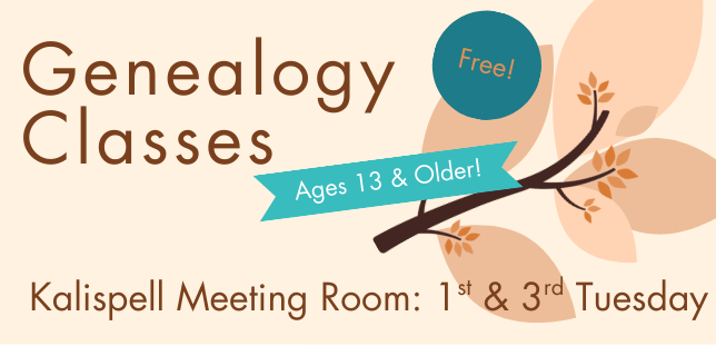 Join instructors from Kalispell’s FamilySearch Center for genealogy classes geared toward individuals and families aged 13 and older. Learn personal researching skills, connect with family history groups, and get expert help navigating genealogical sites. This program will repeat every 1st and 3rd Tuesday in Kalispell. Classes will return to the Bigfork library in the spring.