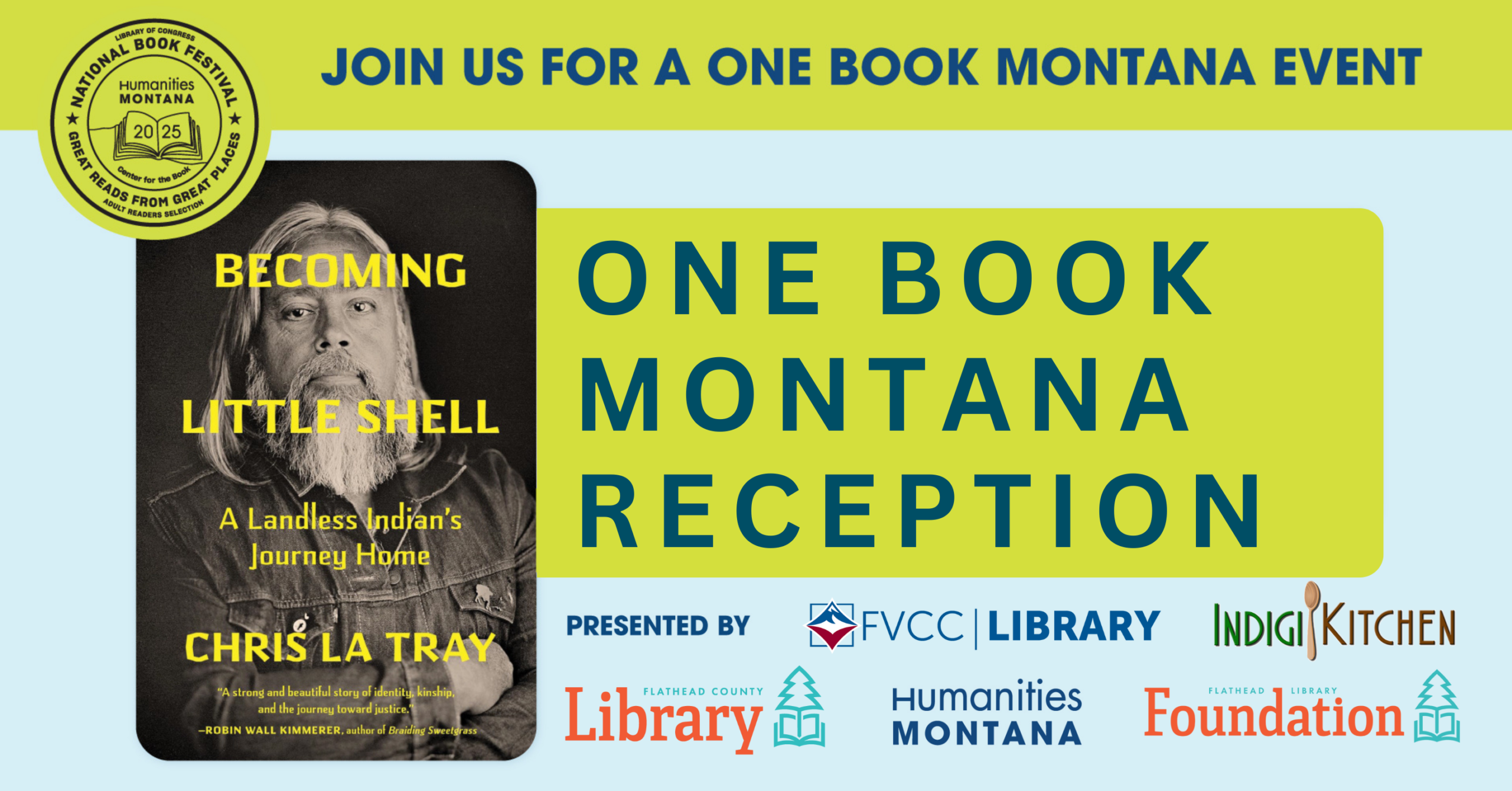 Everyone participating in the One Book Montana Statewide Read is invited to join us for a special gathering with author Chris La Tray. Engage in thoughtful conversation about the book, Becoming Little Shell: A Landless Indian’s Journey Home, deepen your understanding of Montana’s Indigenous cultures, and enjoy samples of traditional Native foods.