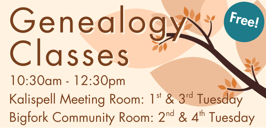 Join instructors from Kalispell’s FamilySearch Center for genealogy classes geared toward individuals and families aged 13 and older. Learn personal researching skills, connect with family history groups, and get expert help navigating genealogical sites. This program will repeat every 1st and 3rd Tuesday in Kalispell and 2nd and 4th Tuesday in Bigfork.